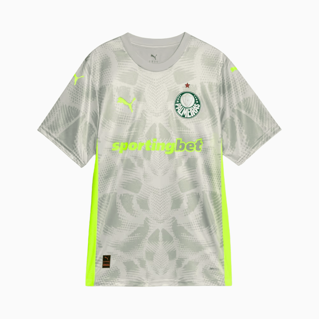 A camisa de goleiro third do Palmeiras para a temporada 2025/26 traz um visual arrojado e inovador, com design exclusivo da linha jogador. Desenvolvida pela Puma, oferece alto desempenho e estilo para quem representa o Verdão com personalidade até debaixo das traves.